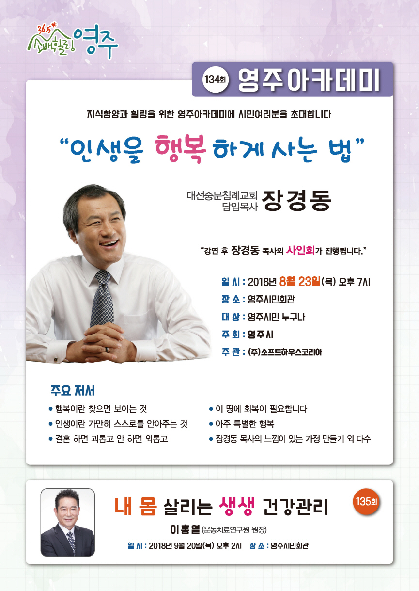 8월 영주아카데미 페이지 정보 작성자 시민회관 댓글 0건 조회 9회 작성일 18-08-10 13:54 본문 <2018년 8월 영주 아카데미 개최 안내>ㅇ 일 시 : 2018. 8. 23(목) 오후7시ㅇ 장 소 : 영주시민회관ㅇ 강 사 : 장 경 동 (대전중문침례교회 담임목사)ㅇ 강의주제 : 인생을 행복하게 사는 법 수정 삭제 목록 댓글목록 댓글목록 등록된 댓글이 없습니다.
