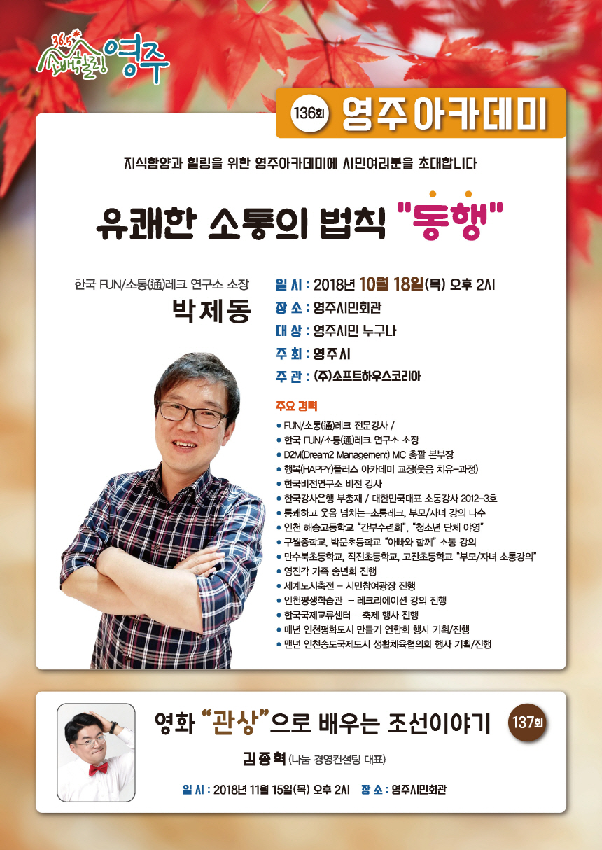10월 영주아카데미 페이지 정보 작성자 시민회관 댓글 0건 조회 9회 작성일 18-10-15 09:49 본문 유쾌한 소통의 법칙-동행▷ 행사명: 10월 영주아카데미-유쾌한 소통의 법칙 "동행" 강 사: 박제동(한국 FUN/소통레크 연구소 소장) 장 소: 시민회관 대강당 일 시: 10. 18(목) 14:00 주 관: 영주시, (주)소프트하우스코리아 수정 삭제 목록 댓글목록 댓글목록 등록된 댓글이 없습니다.