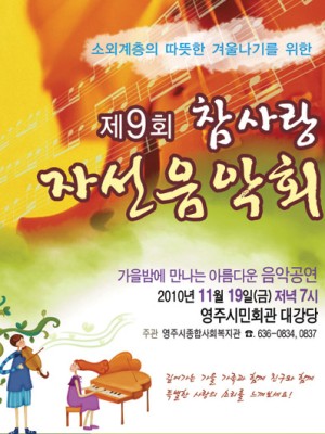 행사명 : 제9회 참사랑 자선음악회일시 : 2010년 11월 19일(금) 저녁7시장소 : 영주시민회관 대강당주관 : 영주시종합사회복지관후원 : . . .