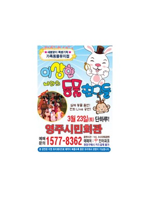 가족동물뮤지컬 "이상한 나라의 동물친구들"*장소 : 영주시민회관*시간 : 13시, 15시*문의 : 1577-8362