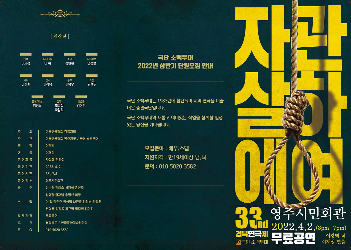 연극-자살에 관하여 페이지 정보 작성자 시민회관 댓글 0건 조회 10회 작성일 22-03-15 16:55 본문 4월 2일(토) 15:00/ 19:00▷ 행사명 : 제33회 경북연극제-자살에 관하여 장 소 : 시민회관 대강당 일 시 : 4. 2(토) 15:00 / 19:00 -2회 주 관 : 한국연극협회영주지부, 극단소백무대 수정 삭제 목록 댓글목록 댓글목록 등록된 댓글이 없습니다.